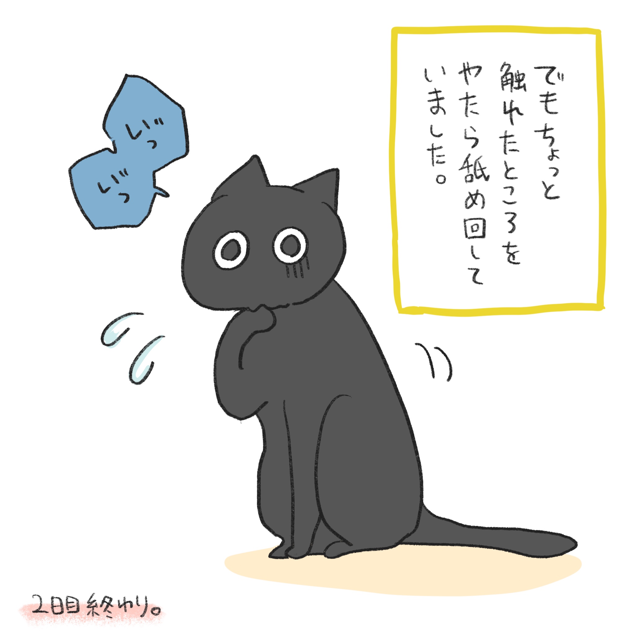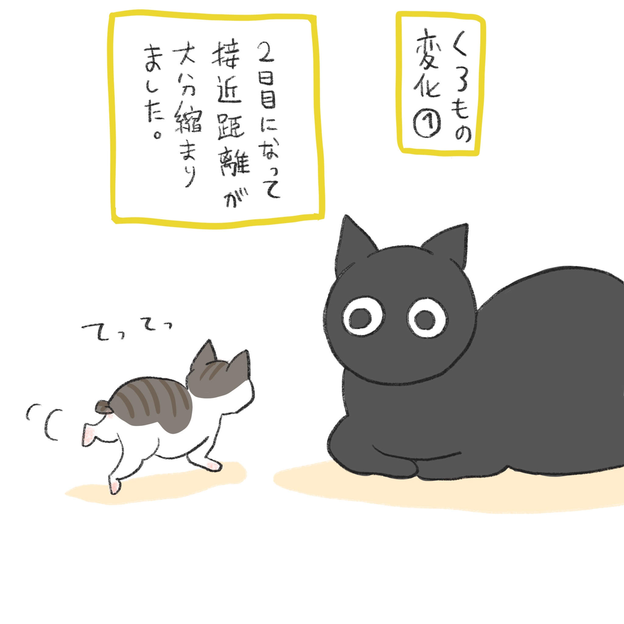 2日目のくろもさん、接近距離が近づいたものの、まだまだ慣れない様子。