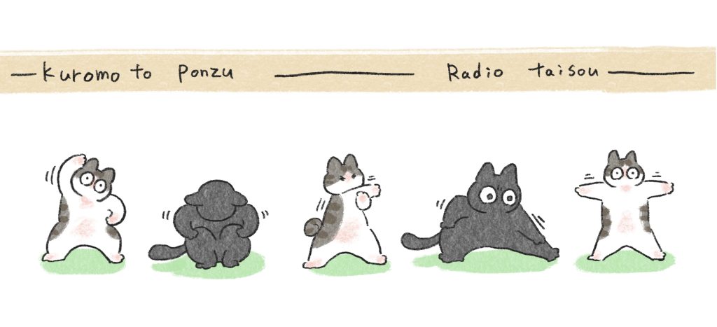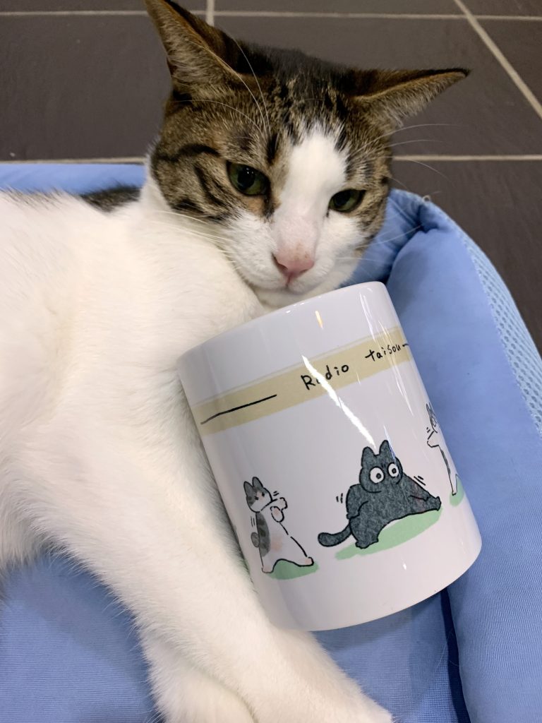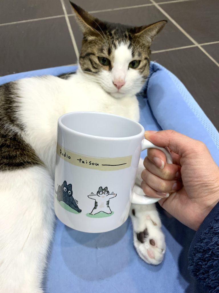 そしてマグカップのイラストはこんな感じでくろもちゃんとぽんずくんが一生懸命ラジオ体操しているイラストになってます📻✨