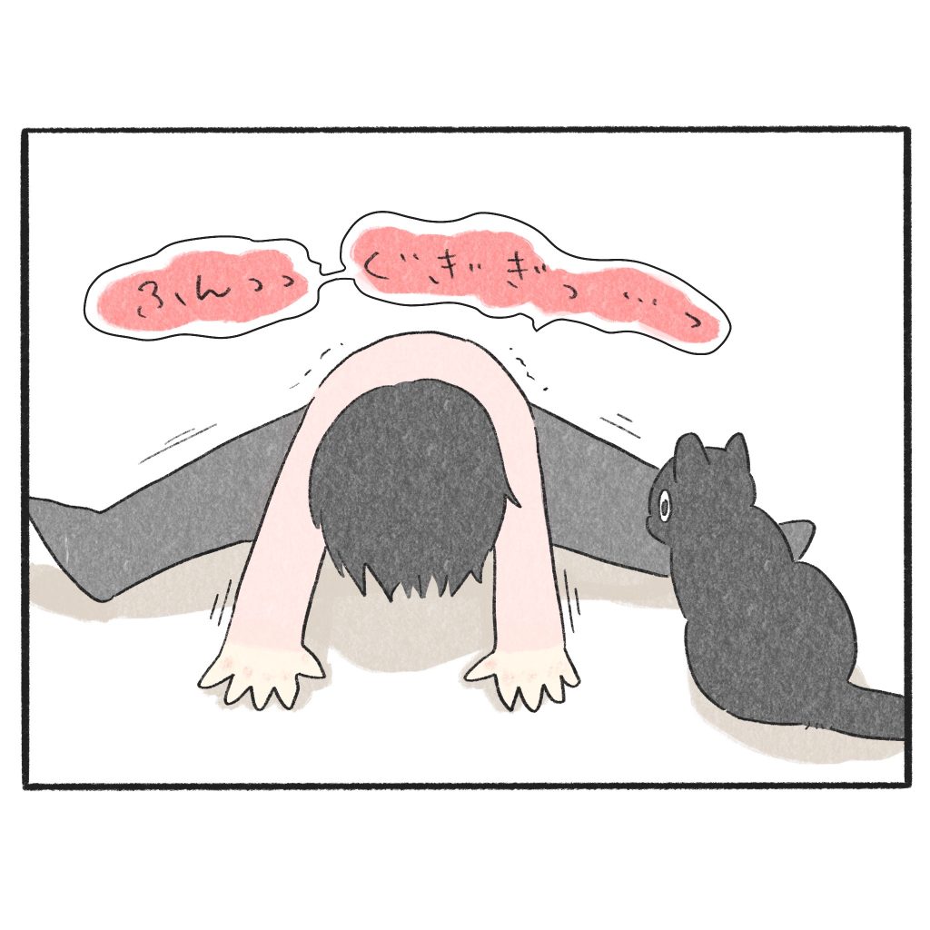 ストレッチする飼い主を不思議そうに見つめるくろもちゃん。